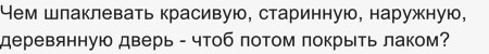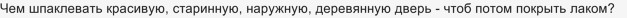 Прежде, чем шпаклевать, дверь нужно хорошо обработать: очистить от старого лака, очистить от старого дерева (снять его шкуркой), заделать трещины, пропитать от рассыхания, пропитать от влаги, гниения, затем можно грунтовать и покрывать лаком.