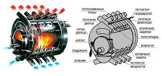 Перегородка в булерьяне одна, расположена как полка, делящая булерьян изнутри приблизительно на 2/3 и 1/3части по высоте. Нижняя часть - для горения топлива, верхняя - для дожига газов.