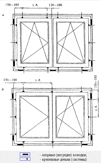 Каждая сторона окна должна крепиться как минимум в трех местах. Расположения опорных клиньев и крепежных деталей можно посмотреть на этом рисунке из общих технических условий СТАНДАРТА: