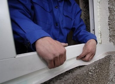 - Следующий этап - установка отлива. Монтажную пену наносим сверху на приклеенную по периметру окна изоляционную ленту и на внешний откос стены - это обеспечит герметизацию и шумоизоляцию отлива. Сам отлив вставляем в паз под рамой и фиксируем саморезами.