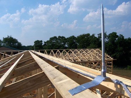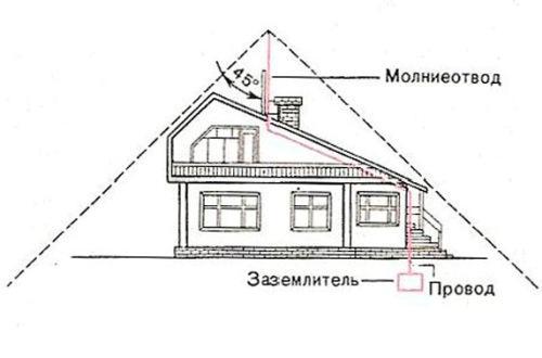 Принцип работы молниеотвода построен по принципу того, что разряд молнии попадает в молниеотвод и отводится в землю.