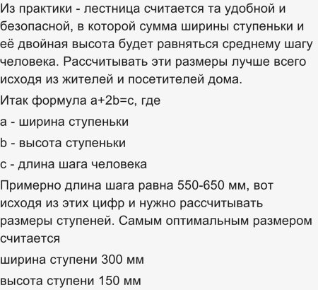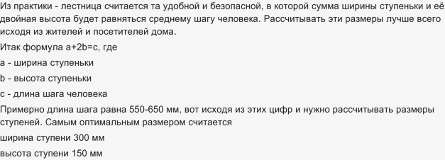 Теперь о формуле для расчёта высоты и ширины ступеней: а+b = 450 ± 20 мм, а - высота и b - ширина.
