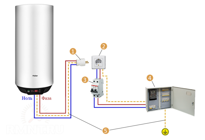 Если от бойлера идёт вилка, то просто монтируем наружную розетку (можно внутреннюю) с заземлением, если нет, то продолжаем.