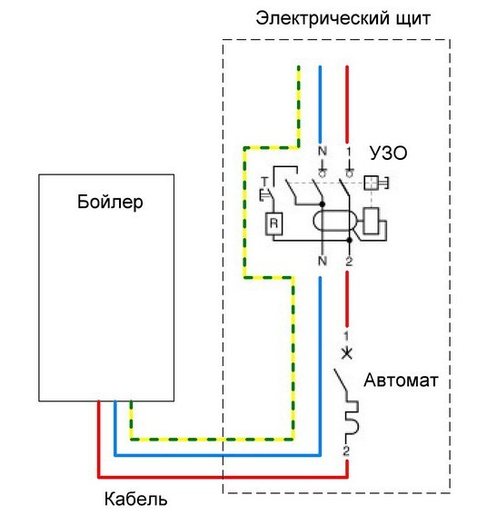 После УЗО желательно ставить автоматы, которые по току нагрузки меньше или равны току нагрузки устройств защитного отключения, то есть, и автомат должен быть 16 А. Есть УЗО уже со встроенными автоматами, но я не сильно рекомендую их применять (только хорошие дорогие немецкие фирмы), лучше по отдельности. И не забывайте про заземление, если у вас в розетке нет провода заземления, то его нужно отдельно проложить! Схема подключения бойлера должна быть следующая: