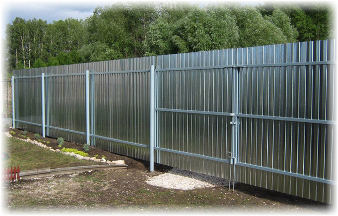 Можно сделать заборы на ленточном фундаменте. К плюсам, забора из профлиста можно ещё отнести то, что этот кровельный материал недорогой, а монтаж займёт немного времени, всё будет зависеть от выбранного вида забора.