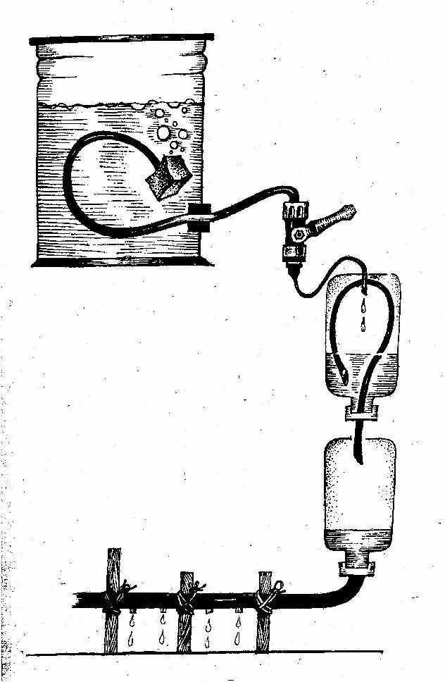 Следует следить что б системы были надежно покрыты грунтом иначе на солнце в них образуются водоросли и забьют отверстия . Скорость вытекания из каждой системы можно регулировать штатным роликовым устройством регулирующим скорость капельницы.
