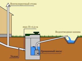 Обычно используется труба диаметром 110-мм, уложенная в траншею под с определённым уклоном, трубы соединены герметично между собой.