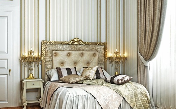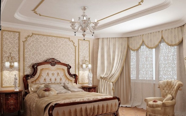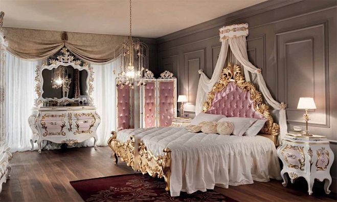 Спальня в стиле Рококо подразумевает наличие лепнины и на стенах и на потолке, шторы определённых форм, мебель помимо роскоши это плавные формы, наличие позолоты в отделке и.т.п.