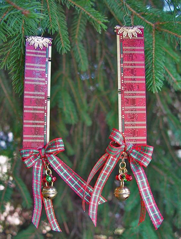 Если в доме есть ненужные старые диски, то из них можно сделать красивые украшения на ель, для этого стоит взять диски, нарисовать на них рисунок, или просто разукрасить в подобранный цвет, приклеить блестящие наклейки и повесить на ель.