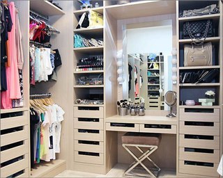 В гардеробной должны находится самые нужные предметы мебели, это может быть небольшой пуфик, зеркало, оно может быть на весть рост, а может быть до половины стены, также, нужно иметь небольшой шкафчик или полочки для хранения мелких предметов одежды.