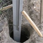 Сами столбы устанавливаются в предварительно сделанные лунки (сплошной фундамент не нужен, как в случае кирпичного забора к примеру.