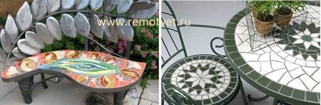 На бетонные поверхности мозаику укладывают на сухие смеси, предназначенные для укладки плитку, а для деревянных поверхностей (скамейки, столешницы и т.д.) мозаику клеить на водостойкий клей.