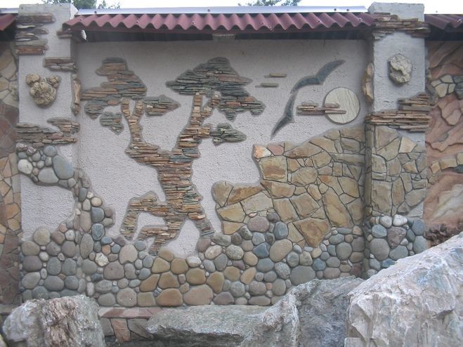 Также можно оформить небольшие мозаичные дворики, площадки, используя принцип зонирования: зона отдыха, зона барбекю, участок возле бассейна и т.д. Мозаичные рисунки можно создать на заборах, на стенах дома или хозяйственных построек, на других вертикальных поверхностях.