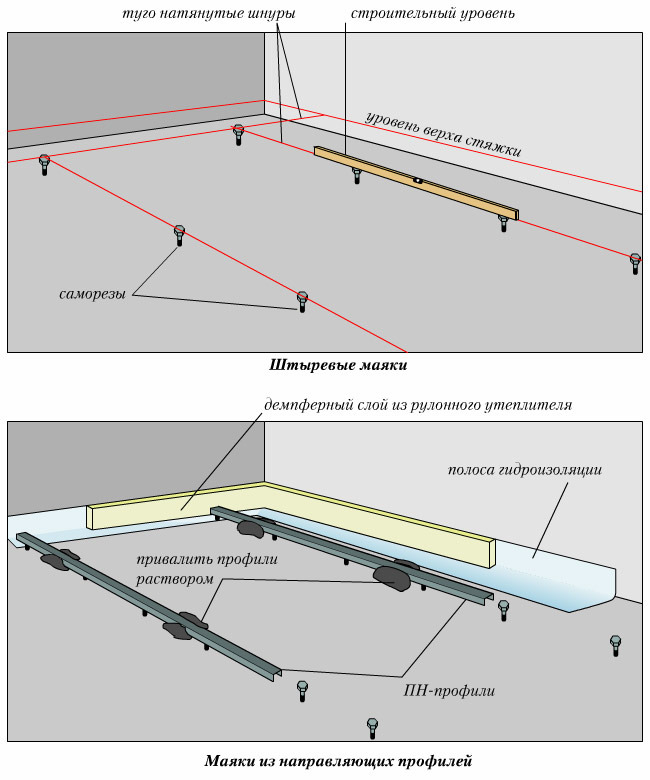 В том случае, когда, как это явствует из вопроса, стяжка является частью конструкции теплого пола, ее монтаж должен соответствовать условиям создания «плавающей» стяжки. Стяжка выполняется таким образом, чтобы она не имела точек соприкосновения со стенами. Получается конструкция, которая не передает на стены и межэтажные перекрытия ударные и звуковые волны, а также задерживает тепло. Устройство стяжки выполняется по предварительно выставленным маякам с помощью правила. После ее незначительного затвердевания поверхность стяжки выравнивается терочкой.