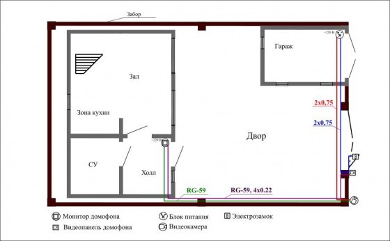 Монтаж начинается с размещения всех элементов, входящих в состав конструкции видеодомофона, по местам согласно прилагаемой схемы