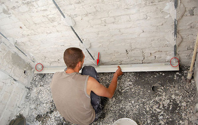 - выставление по стене строго вертикальных маяков;.