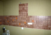 Опять же говорю за себя, я не сторонник этих "заплаток" в виде фартука и кладки кафеля между шкафчиками, ведь этими "заплатками" достигается иллюзия полной облицовки стены кафелем.