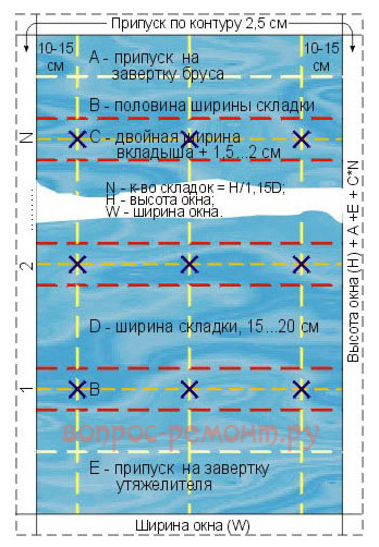 Изготовление рулонных штор гораздо проще римских, поэтому их и изготавливают хозяйки в большинстве случаев. Схему раскроя ткани для таких штор прилагаю