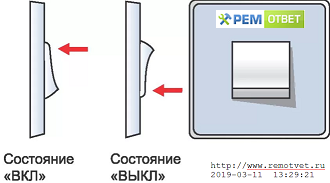 В начале выключаем электричество, если выключатель установлен правильно, то в выключенном состоянии жмём на клавишу вниз, вот так это выглядит на схеме.
