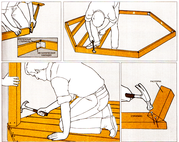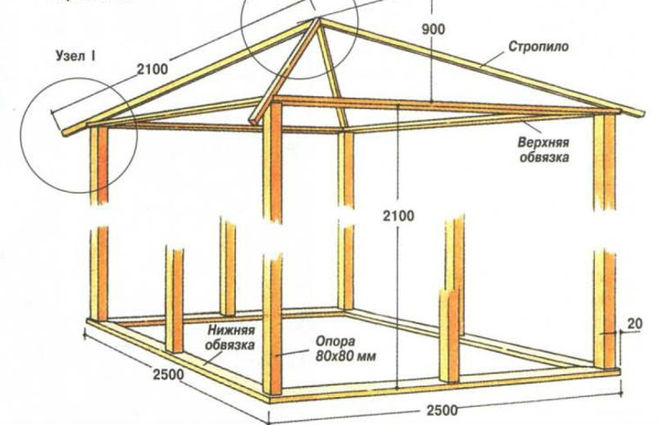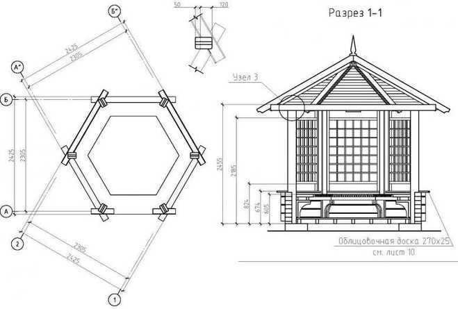 Для примера прилагаю схему (чертеж) устройства шестигранной беседки
