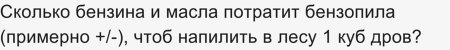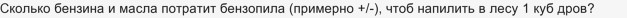 Приблизительно в районе полулитра бензина уйдёт на резку куба дров (+-) бензин АИ 92-а, или АИ 95-ь (и тот и этот используют в бензопилах)