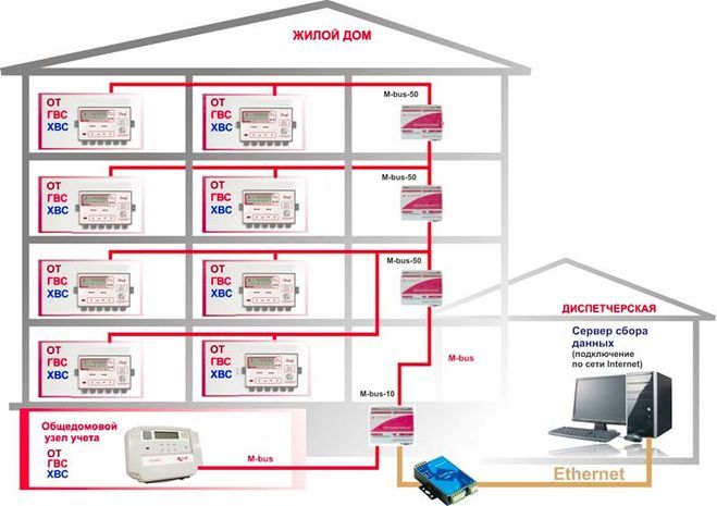 Настоятельная рекомендация, перед тем как устанавливать «внутридомовой счетчик на отопление на многоквартирный дом» в специализированной инжиниринговой организации, имеющей соответствующие допуски заказать проект коммерческого узла учёта тепловой энергии конкретно для вашего дома с системой диспетчеризации, например по схеме, как на рисунке ниже: