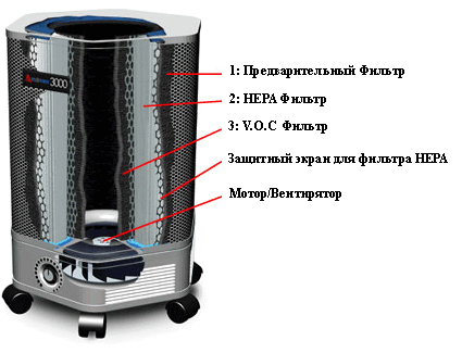 в наличии фильтр предварительно очистки, HEPA-фильтр, угольный фильтр, фотокаталитический фильтр с УФ лампой, трёхскоростной режим работы, очистка воздуха практически идеальная (на уровне 99,97%).