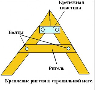 Обычно эта конструкция выдерживает основные нагрузки, выпадающие на долю кровли, но если она покажется Вам не внушающей доверия, то дополнительно можно усилить её с помощью ригеля