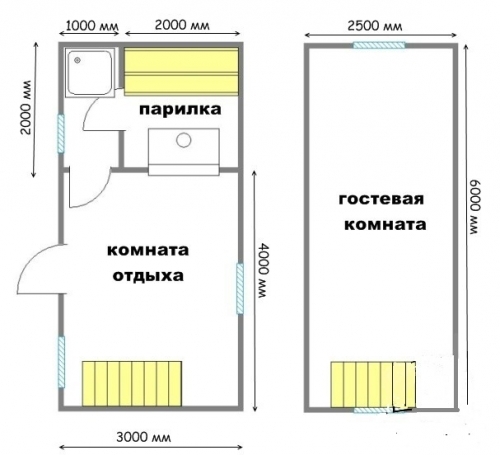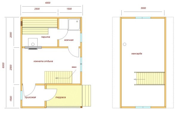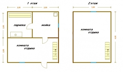 В случае, если земельный участок, где будет строиться баня, небольшой (4х4 м), то вот пример планов