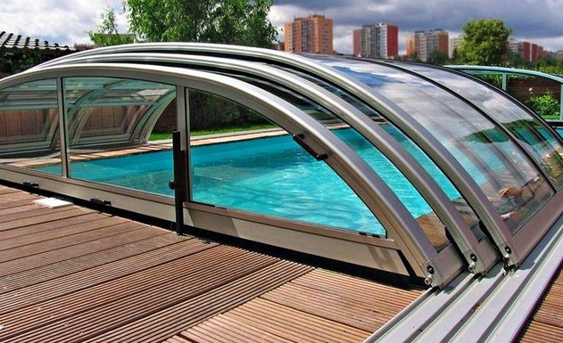 Предположу что речь идёт о так называемых "раздвижных стеклянных павильонах для бассейнов".