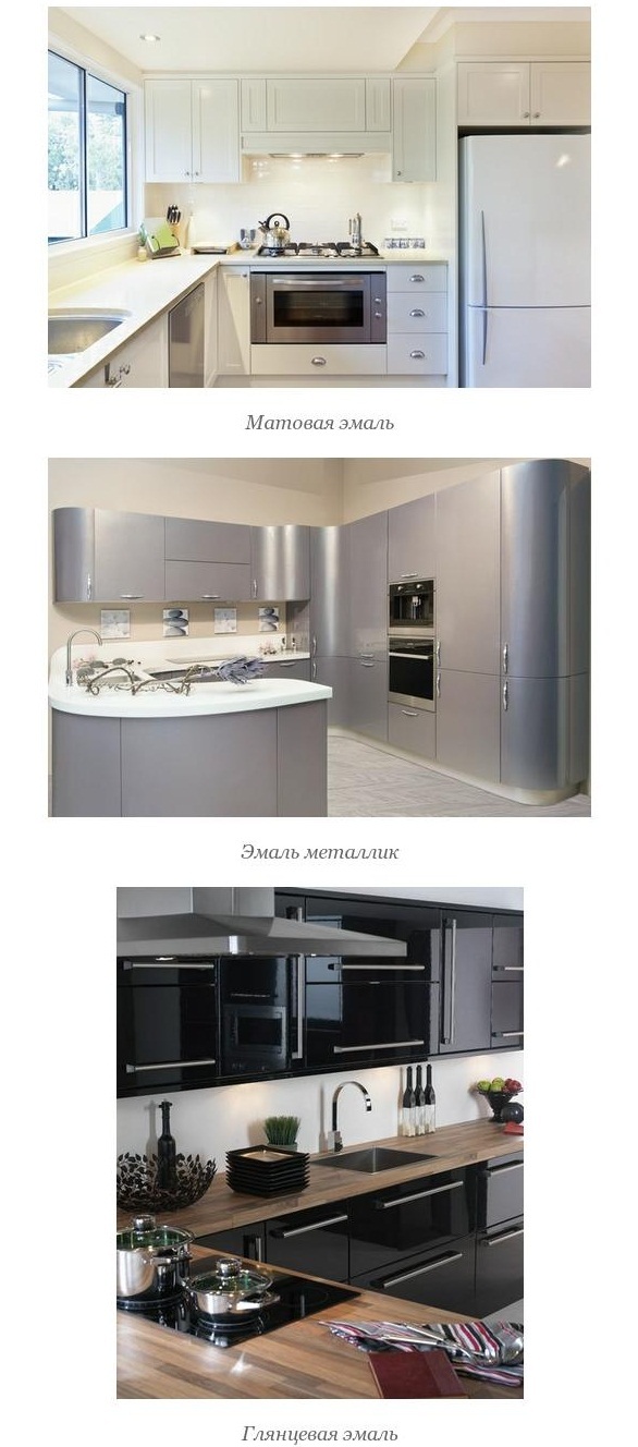 При выборе эмалевых фасадов обращайте внимание на такие нюансы: предпочтение лучше отдать фасадам с 8-мью слоями краски, а не 4-я. В качестве основания не стоит выбирать пластик, лучше отдать предпочтение МДФ, так как пластик плохо держит краску и со временем краска может отслоиться.