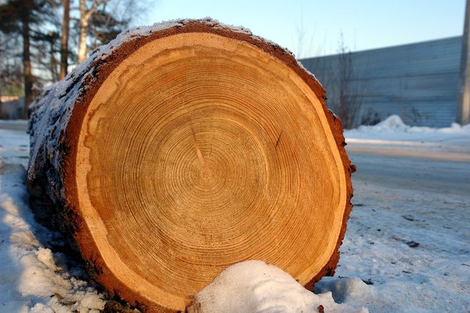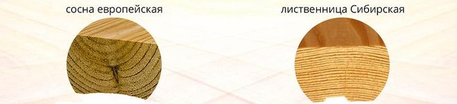 Если есть возможность увидеть торец бревна (то есть спил, срез) то годовые кольца у лиственницы расположены ближе друг к другу и их больше