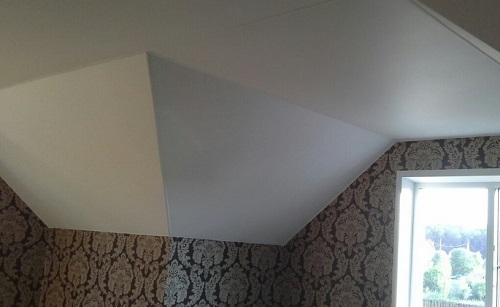 Такие поверхности обтягиваются посредством реечных закладных и соединительного профиля. Например, тканевые полотна заправляются в общий щелевой профиль. С пленочными сложнее, так как приходится заправлять маскировать широкую щель между плоскостями. Для создания такой геометрии лучше выбирать системы, у которых соединительный профиль позволяет монтаж полотна под углом. Подбирается индивидуально.