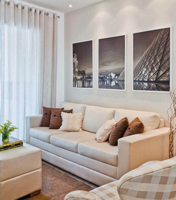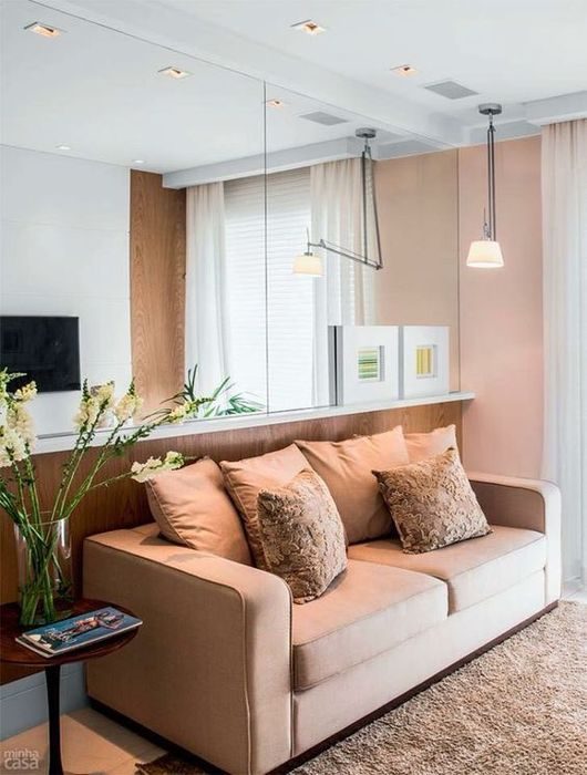Одним из самых лучших вариантом будет развесить на стенах возле дивана и кресла - зеркала, благодаря им, комната визуально увеличится, и она не будет выглядеть узкой и маленькой.