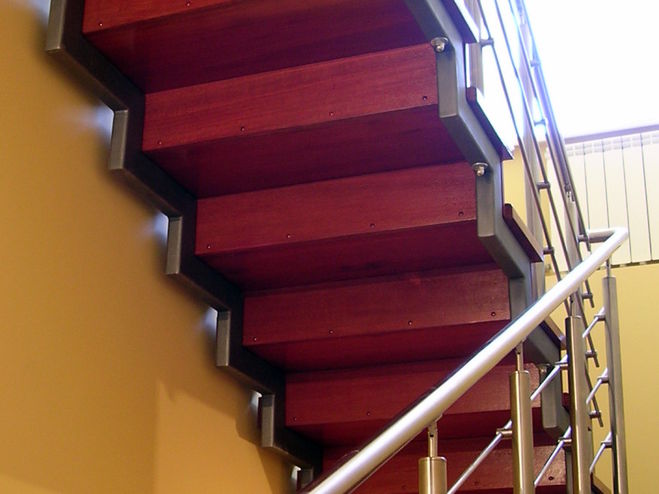 Ступени и подступенки лучше всего отделывать деревом. Сосна сравнительно недолговечная и вообще проблемная, поэтому лучше взять породы получше, в идеале дуб или лиственница. С помощью саморезов или шпилек снизу дерево фиксируется на каркасе. лучше сначала закрепить подступенок, а затем сверху уже уложить деталь проступи, сделав нависающий край.