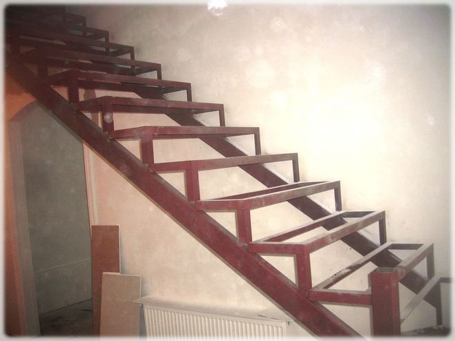 Если лестница маршевая, можно изготовить ее из швеллера и уголков. Понадобятся два косоура, опорные столбы для большей надежности и уголки для монтажа каркаса ступеней. Несущие элементы крепятся к стене, полу первого этажа и потолку с помощью анкерных болтов. Соединяются детали путем их сваривания.