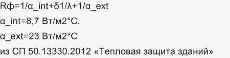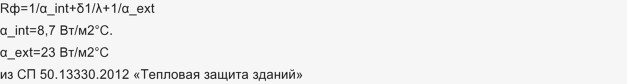 Rф=1/8,7+0,2/0,13+1/23=0,11+1,5+0,04=1,61 м2℃⁄Вт.