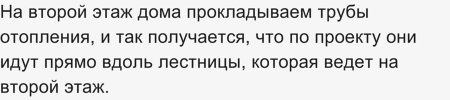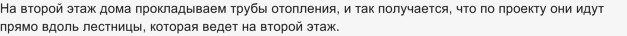 Даже если Вы купили готовый проект дома, не один уважающий себя проектировщик не будет проектировать трубы отопления вдоль лестниц, + в любой проект могут быть внесены изменения по просьбе заказчика.