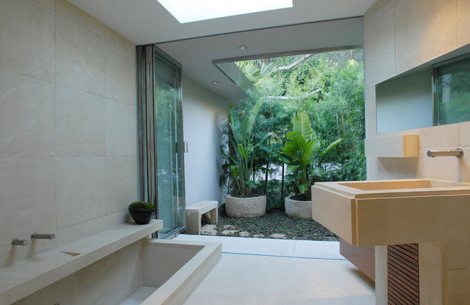 Либо можно сделать комнату-пристройку к ванной комнате. Зимний сад будет напротив ванны и вы будете практически в зимнем саду. Вот, к примеру.