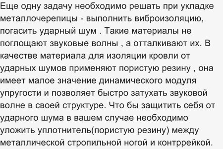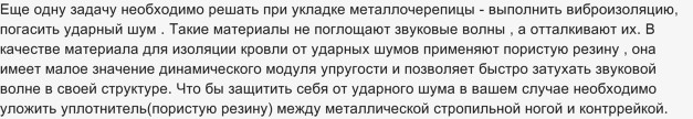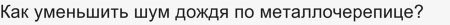 Даже при правильно уложенной металлочерепице слышен сильный шум от дождя, происходит это потому, что капли ударяют в тех местах черепицы, где нет плотного соединения с деревом, то-есть на волнах. Для приглушения звука от капель дождя недостаточно проложить шумоизоляцию в пространствах между волной и обрешеткой, нужно, чтобы шумоизоляция пластом заходила и в то место, где идет крепление саморезом. В месте крепления саморезом мало шумоизоляционного материала, нужен еще кусочек тонкой резины или по всей длине полоска из тонкой резины.