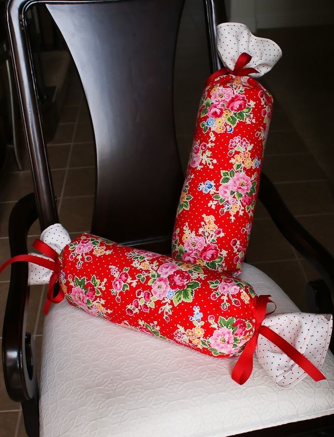 На мой взгляд, проще всего сшить в машину подушку-валик в форме большой конфеты. Смотрится такая подушка-валик очень даже оригинально и делать ее проще простого.