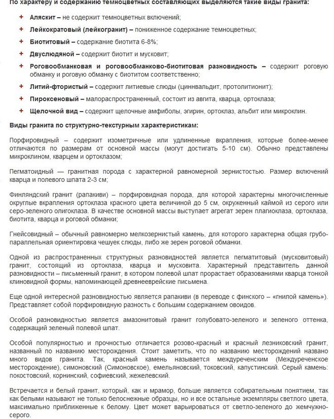 Гранит (лат. "гранум" - зерно) зернистый, кристаллический камень. Встречается повсеместно в виде огромных массивов (батолитов) твердой (мрамор в два раза мягче) вулканического происхождения, горной породы. Твердость граниту придает кварц (до 30%), поддается он обработке только инструментом с алмазными насадками. Кроме кварца в состав входят: шпаты (до 70%) и другие минералы (до 10%), например - биотит, чем темнее гранит, тем больший процент их содержания.