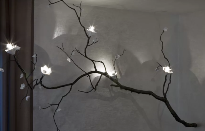 Здесь поле для фантазий. Такой природный материал как ветви и сучья деревьев, из-за своих мягких линий, уже кажется теплым, а если оснастить его лампочками, это еще более подчеркнет плавность его форма.