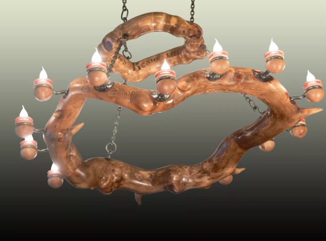 Материалы для электрической части такой люстры, должны быть подобраны особенно тщательно. Провод должен быть обязательно в двойной изоляции, так как непосредственная близость деревянной конструкции требует большего внимания к безопасности. В заводских люстрах, провода в одинарной изоляции как правило идут в металлических трубках выполняющих роль "рожков" или "стоек" люстры.