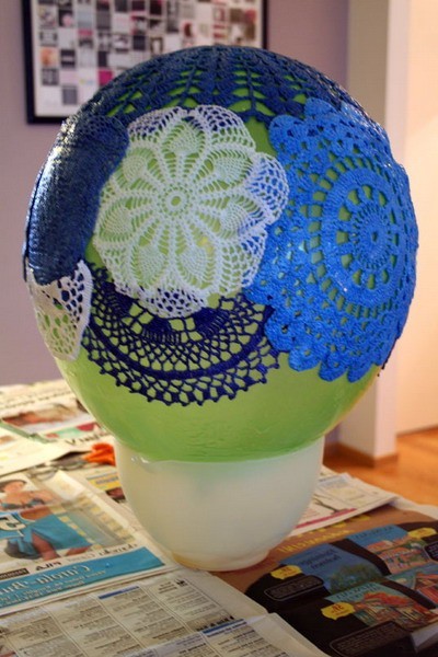 Чтобы из кружев сделать светильник понадобится: шнур, цоколь, вязальные салфетки, которые можно связать самостоятельно, а можно купить в магазине, а также, воздушный шарик, обойный клей.