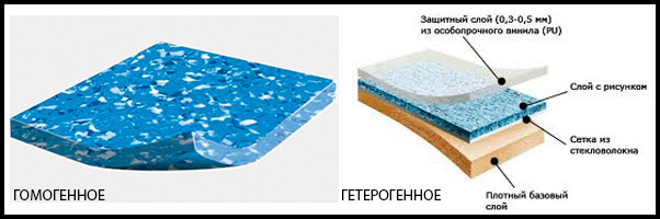 Линолеум бывает двух основных типов: гомогенный и гетерогенный.