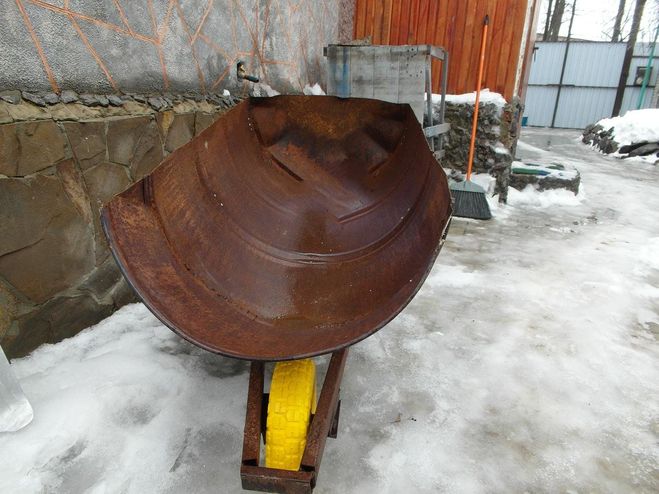 . Можно изготовить из железной бочки или пластиковой бочки разрезав ее вдоль пополам . Изготовить каркас самое сложное один из вариантов каркаса – сварить его из квадратного прута размером в поперечном сечении 25 мм. На ось нужно посадить два колеса.
