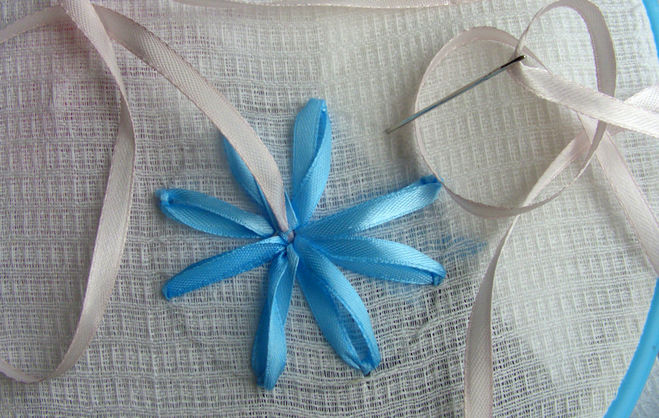 Результат красиво смотрится на любых фактурах. Важно не помять ленту в процессе работы и не слишком затягивать стежки.