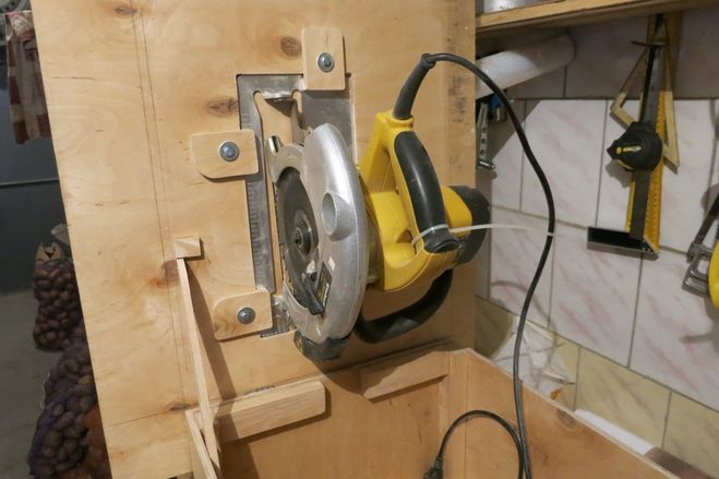 Что касаемо стационарной установки. Берёте любой подходящий стол, вырезаете-выдалбливаете квадратное отверстие по размеру стола пилы, с уступом. Чтоб стол пилы был ровный со столом. Выключатель привязываете или делаете скобу (проволока, полоска), чтоб был постоянно включен. Пользуетесь только вилкой. Безопаснее сделать выключатель с розеткой на столе. Это на ваше усмотрение.