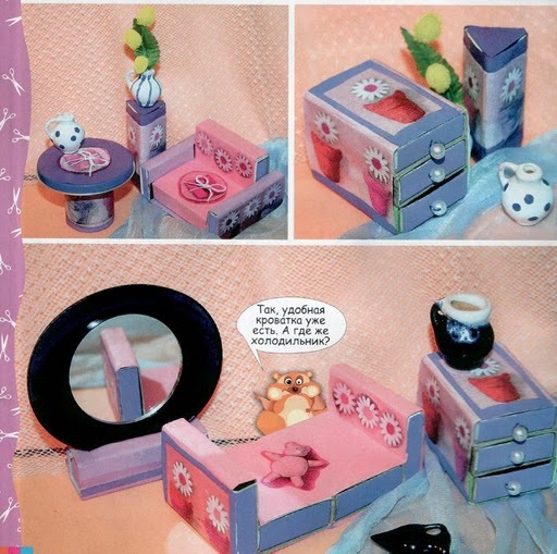 Как видите, из пустых спичечных коробков можно сделать самую разнообразную кукольную мебель. Это могут быть: стульчики, столы, тумбочки, диваны, шкафчики, кресла, кровати и т.д.